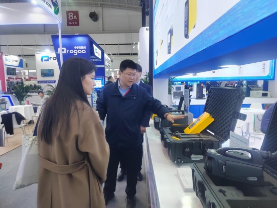 中國環(huán)境監(jiān)測總站副站長毛玉如蒞(左三)臨天瑞儀器展臺參觀,天瑞儀器副總經理、磐合科儀董事長黎橋(右一)熱情接待