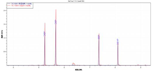 樣品加標(biāo)TIC圖(藍(lán)色)與鄰苯混標(biāo)TIC圖(紅色)