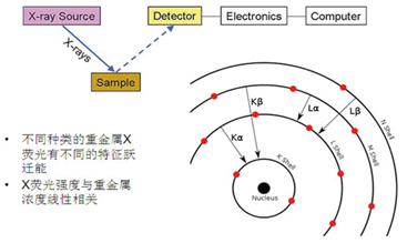 X射線熒光光譜技術(shù)(XRF)的原理見(jiàn)圖3所示,可以直接檢測(cè)固體或液體樣品中ppm量級(jí)的元素成分。采用富集后再檢測(cè)的辦法,使得XRF技術(shù)對(duì)空氣顆粒物中的重金屬成分的檢測(cè)限優(yōu)于0.001ug/m3。而常規(guī)實(shí)驗(yàn)室的檢測(cè)技術(shù),由于預(yù)處理消解過(guò)程中需要將微克量級(jí)的樣品溶解到幾十克的液體中,而使得濃度被稀釋百萬(wàn)倍,從而多數(shù)儀器(譬如ICP-AES、或原子吸收光譜儀)無(wú)法檢出元素含量低于10ug/m3量級(jí)的空氣顆粒物樣品。
