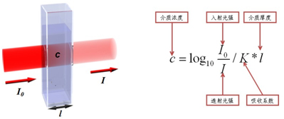 光度比色法主要是根據(jù)朗伯比爾定律,一束單色光照射于一吸收介質(zhì)表面,在通過(guò)一定厚度的介質(zhì)后,由于介質(zhì)吸收了一部分光能,透射光的強(qiáng)度就要減弱。吸收介質(zhì)的濃度愈大,介質(zhì)的厚度愈大,則光強(qiáng)度的減弱愈顯著。