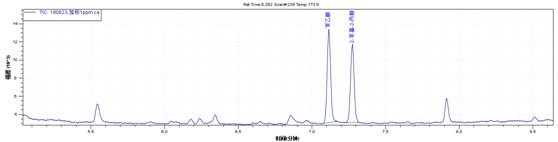 目標(biāo)物在0.1ppm-2ppm線性良好。取空白鞋材樣品加標(biāo),樣品經(jīng)過(guò)丙酮超聲萃取。1ppm加標(biāo)水平下譜圖如下,得到了比較滿意的效果。