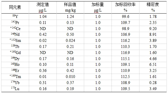 參考《GB/T 18115.1-2020 稀土金屬及其氧化物中稀土雜質(zhì)化學(xué)分析方法 第1部分:鑭中鈰、鐠、釹、釤、銪、釓、鋱、鏑、鈥、餌、銩、鐿、镥和釔量的測(cè)定》,將高純氧化鑭用稀硝酸溶解,利用內(nèi)標(biāo)法進(jìn)行校正??疾旒訕?biāo)回收率及精密度。方法加標(biāo)回收率為98.9%~116.9%,精密度為0.28%~9.20%。