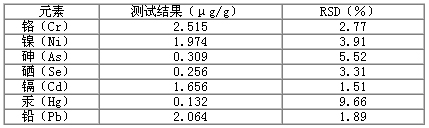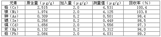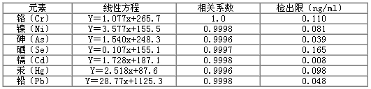 Hg標液單獨為一組。Cr 、Ni 、As 、Se 、Cd 和Pb 標液用各元素10μg/mL的標液稀釋至所需濃度。配制Hg標液時加入0.1mL 20 μg/mL金標準溶液。分析結(jié)果(表2)顯示,這7種元素的線性方程的相關(guān)系數(shù)為0.9996~1.000 ,檢出限為0.008~0.165ng/mL。