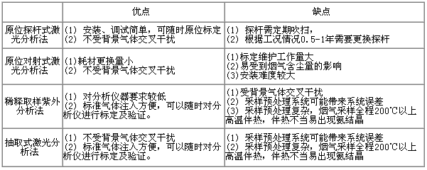 脫硝氨逃逸濃度的量級(jí)一般都是幾個(gè)ppm,對(duì)其準(zhǔn)確測量比較困難。目前國內(nèi)外用于煙氣脫硝系統(tǒng)氨逃逸在線監(jiān)測的方法主要有以下幾種,優(yōu)缺點(diǎn)如下: