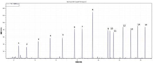 1.正己烷 2. 3.三氯乙烯 4.甲苯 5.辛烯 6.乙酸丁酯 7.乙苯 8.對(間)二甲苯9.鄰二甲苯 10.苯乙烯 11.壬烷 12.異辛醇 13.十一烷 14.十四烷 15.十六烷