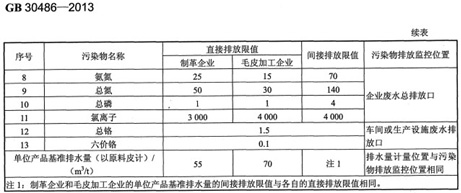 《制革及皮毛加工工業(yè)水污染物排放標(biāo)準(zhǔn)》(GB30486-2013)中明確規(guī)定了,制革及毛皮加工企業(yè)水污染物排放值、監(jiān)測(cè)和監(jiān)控要求,以及標(biāo)準(zhǔn)的實(shí)施和監(jiān)督等相關(guān)規(guī)定,其中2014年3月1日后新建企業(yè)其污水中總鉻的排放標(biāo)準(zhǔn)為1.5mg/L,六價(jià)鉻的排放標(biāo)準(zhǔn)為0.1mg/L,其排放監(jiān)控位置為車(chē)間或生產(chǎn)設(shè)施廢水排放口;2014年3月1日前已有企業(yè)其污水中總鉻的排放標(biāo)準(zhǔn)為1.5mg/L,六價(jià)鉻的排放標(biāo)準(zhǔn)為0.2mg/L,其排放監(jiān)控位置為車(chē)間或生產(chǎn)設(shè)施廢水排放口;2016年1月1日后,所有企業(yè)均按新建企業(yè)標(biāo)準(zhǔn)執(zhí)行。