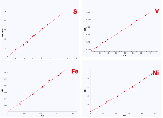 上圖為使用EDX 6000C能量色散熒光光譜儀測(cè)量不同含量石油焦二次標(biāo)樣,建立S、V、Fe、Ni元素含量與強(qiáng)度的一次或二次校正工作曲線。由圖可知,S、V、Fe、Ni組分含量與強(qiáng)度具有非常好的線性關(guān)系。