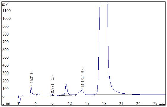 準確稱取0.2g(精確至0.0001g)試樣,采用氧彈燃燒后冷卻定容,經0.22μm的水系濾膜過濾后上機得到測試譜圖如下圖2、圖3所示。