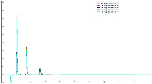 取2.0μg/mL F-、Cl-、Br-混合標準標準溶液重復進樣6次,考察保留時間和峰面積的重復性,詳見圖4;其中保留時間(tR)相對偏差在0.10%-0.16%之間,峰面積(S)的相對標準偏差在0.38%~0.53%之間,重復性結果詳見表1。
