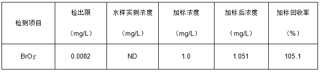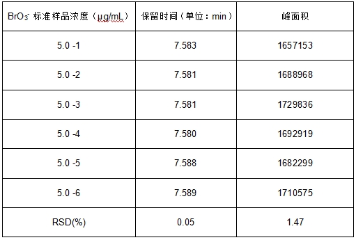 取5.0μg/mL溴酸根標(biāo)準(zhǔn)溶液重復(fù)進(jìn)樣6次,考察保留時間和峰面積的重現(xiàn)性,重現(xiàn)性結(jié)果詳見表3。