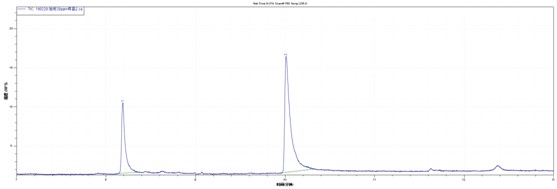 目標(biāo)物在5ppm-100ppm線性良好。取空白食品樣品加標(biāo),樣品經(jīng)過正己烷和乙酸乙酯(1+1)超聲萃取。20ppm加標(biāo)水平下譜圖如下,得到了比較滿意的效果。
