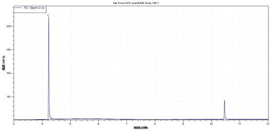 目標(biāo)物在5ppm-100ppm線性良好。取低含量尼古丁加標(biāo),樣品經(jīng)過乙酸乙酯超聲萃取。50ppm加標(biāo)水平下譜圖如下,得到了比較滿意的效果。